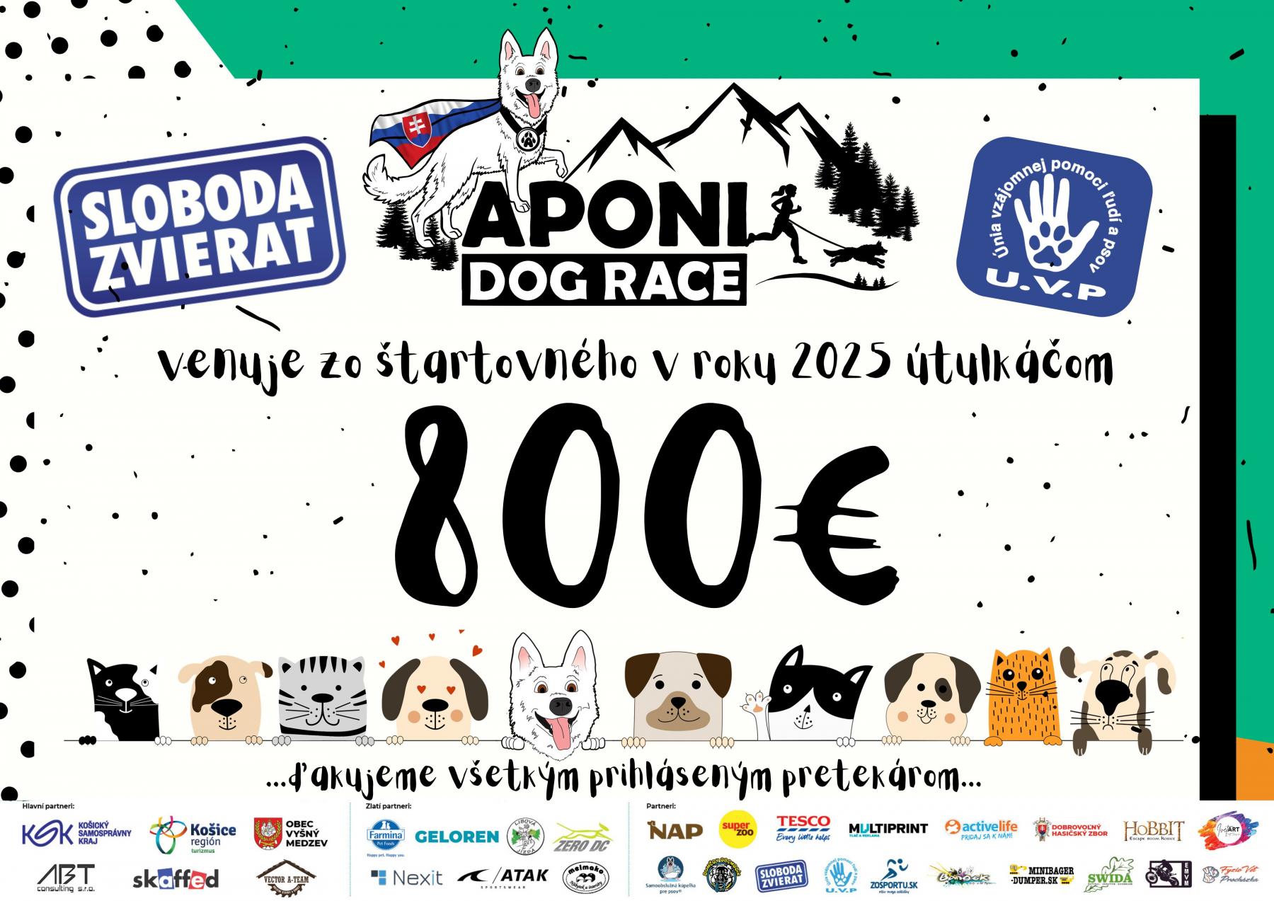 APONI DOG RACE nie je len o športe a zážitkoch. Každým podujatím sa snažíme pomáhať aj tým, ktorí to najviac potrebujú. Z každého štartovného venujeme výťažok Slobode zvierat a UVP Košice. Tento rok sa nám spoločne podarilo vyzbierať krásnych 800 €. 🧡